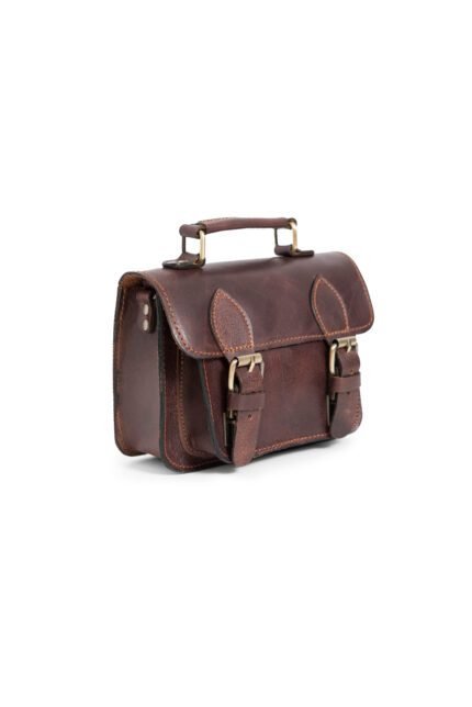 Brown wax Vintage-inspired leather satchel for women with double buckle closure and top handle by Jirakis Leather.