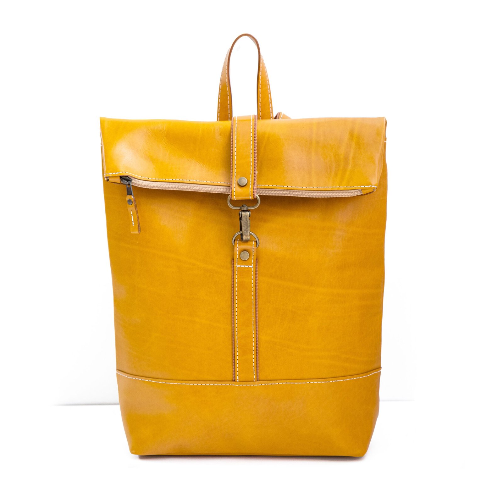 Handmade yellow leather rolltop backpack with buckle for women and men, crafted in Crete
