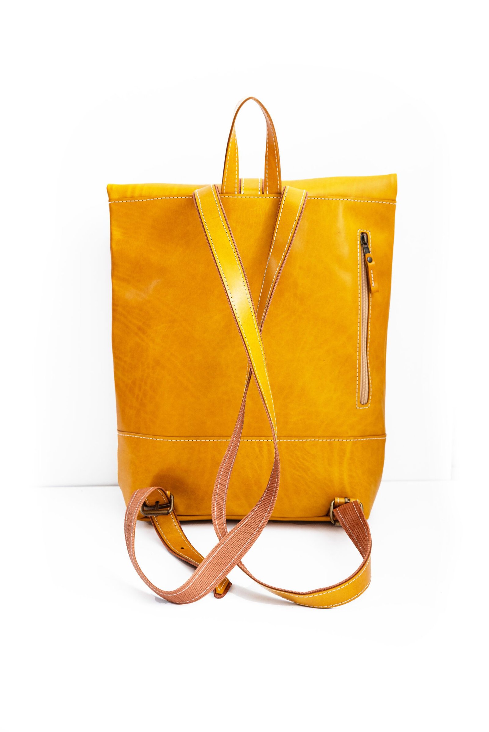Back view of yellow leather rolltop backpack with adjustable straps and zipper pocket