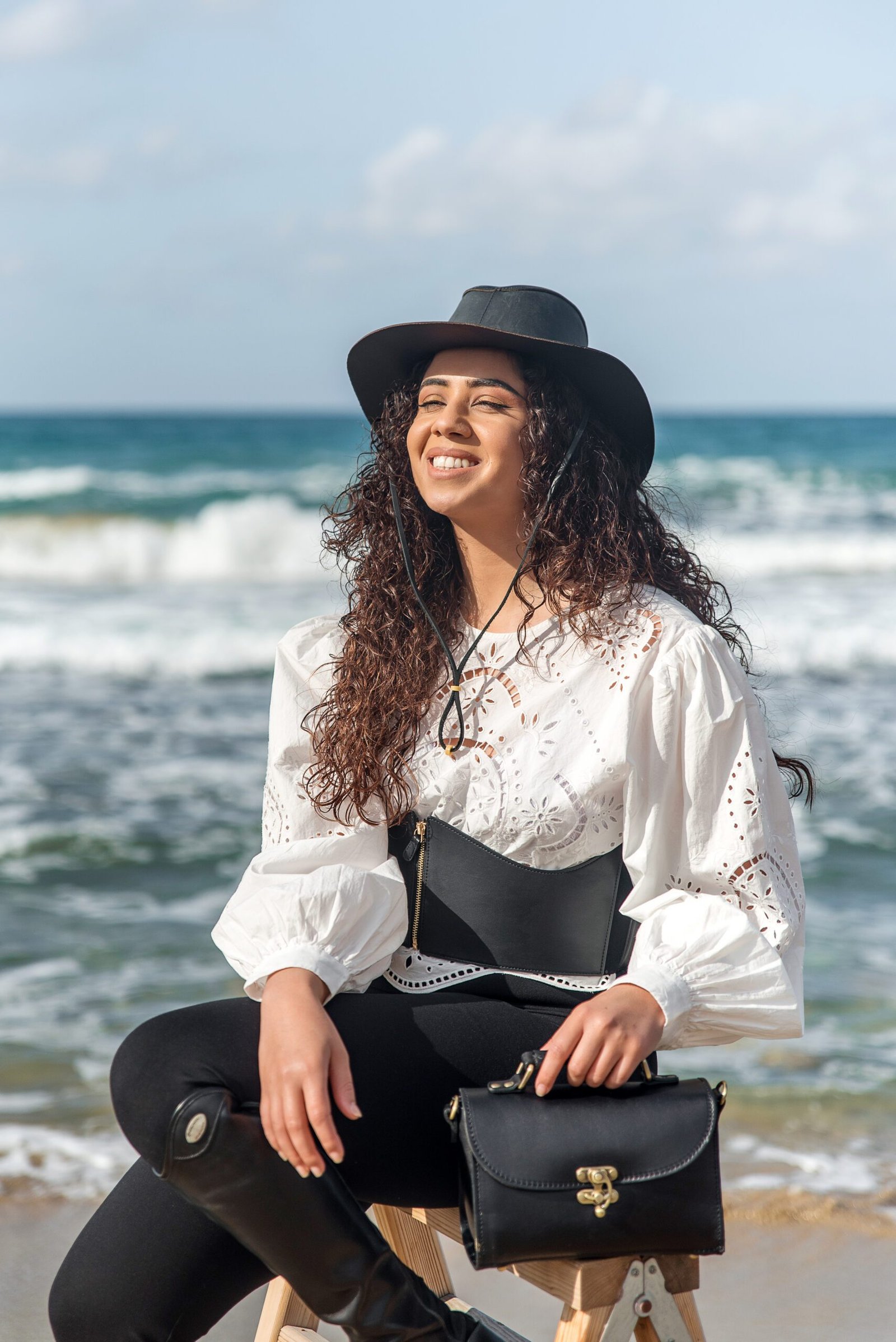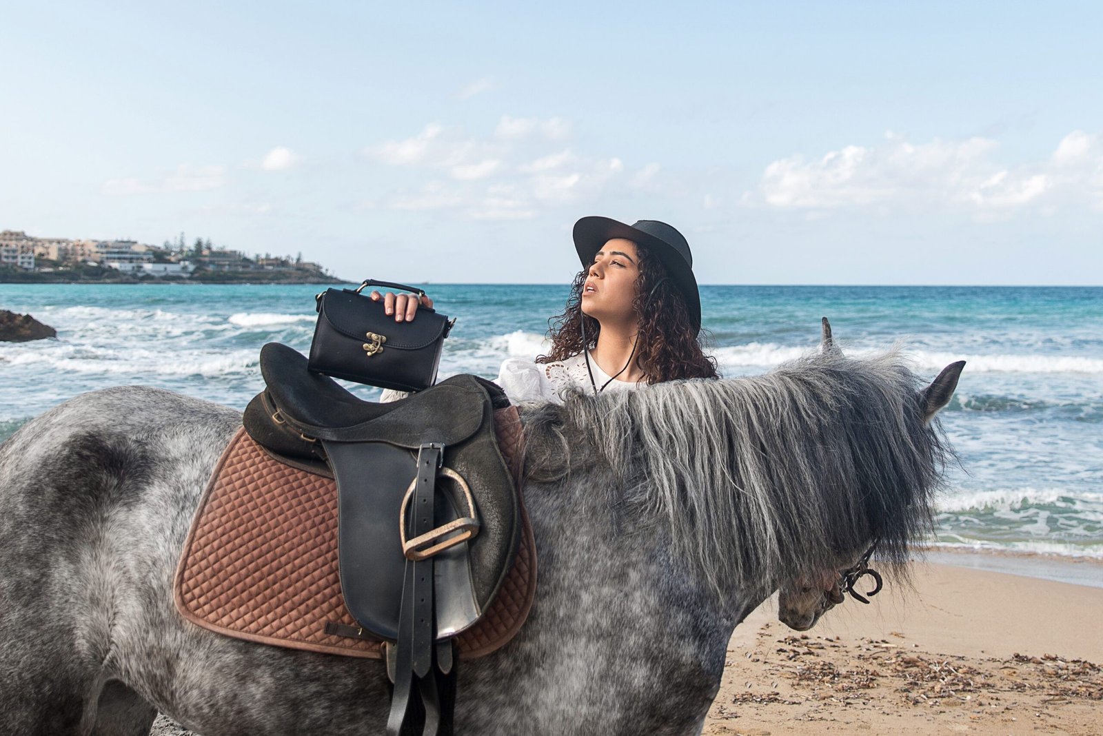 Woman with black leather lock satchel bag standing on the beach beside a white horse – handcrafted Greek leather bag