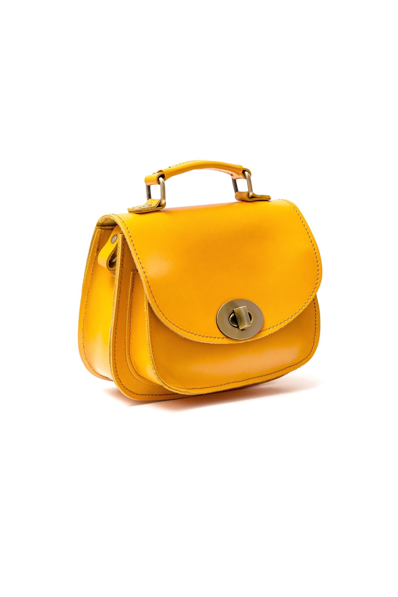 woman holds yellow Leather flap shoulder bag for women with classic structured shape and adjustable strap by Jirakis Leather.