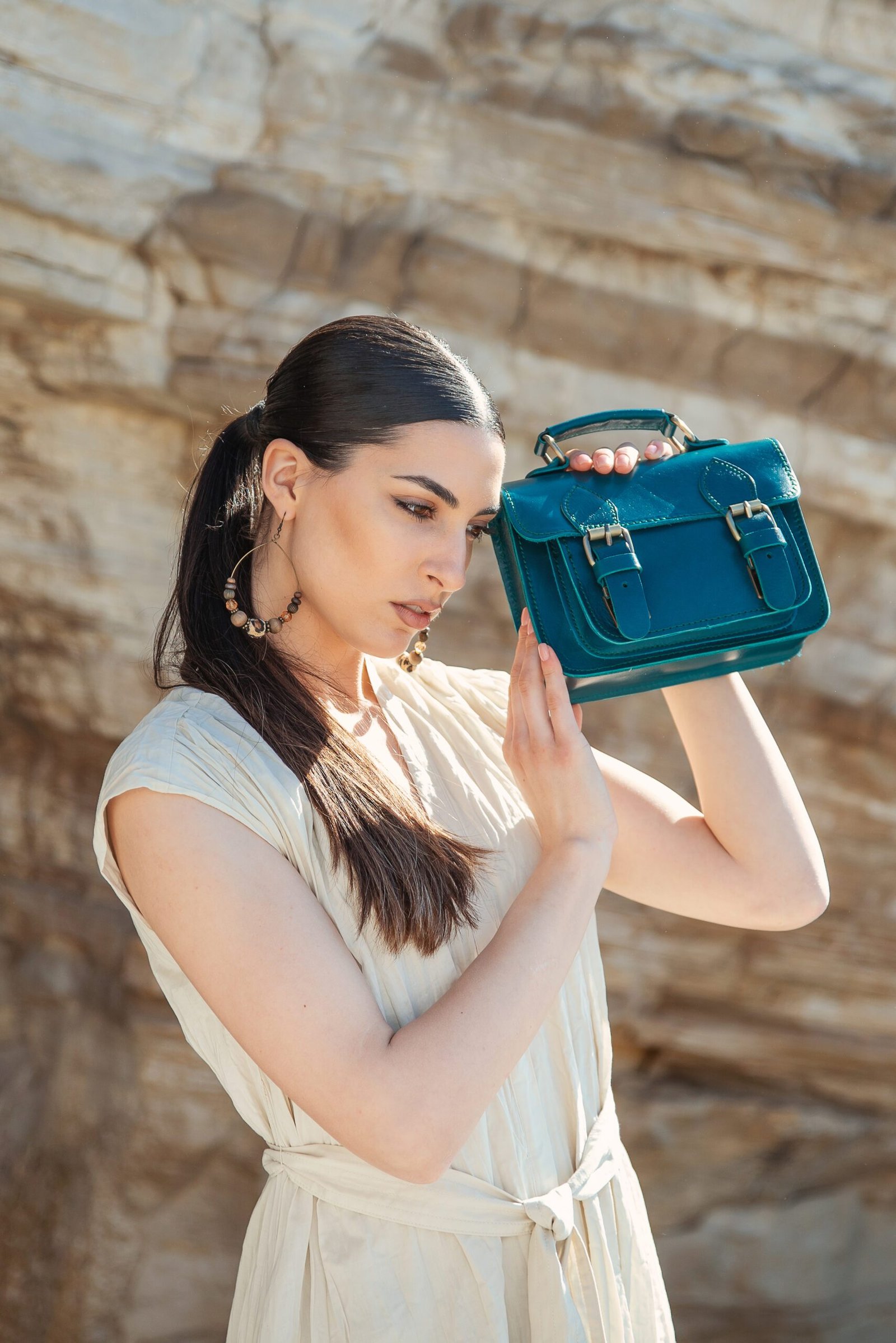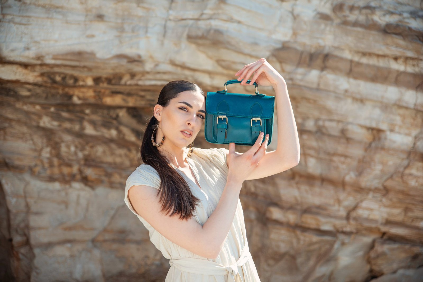 Woman holding a small leather mini satchel bag for women by Jirakis Leather.