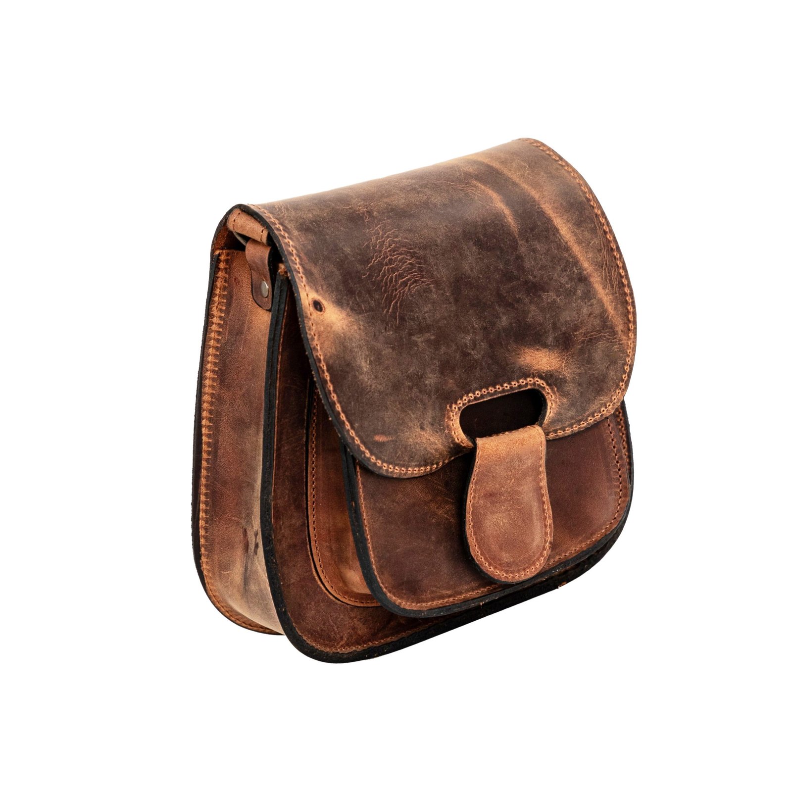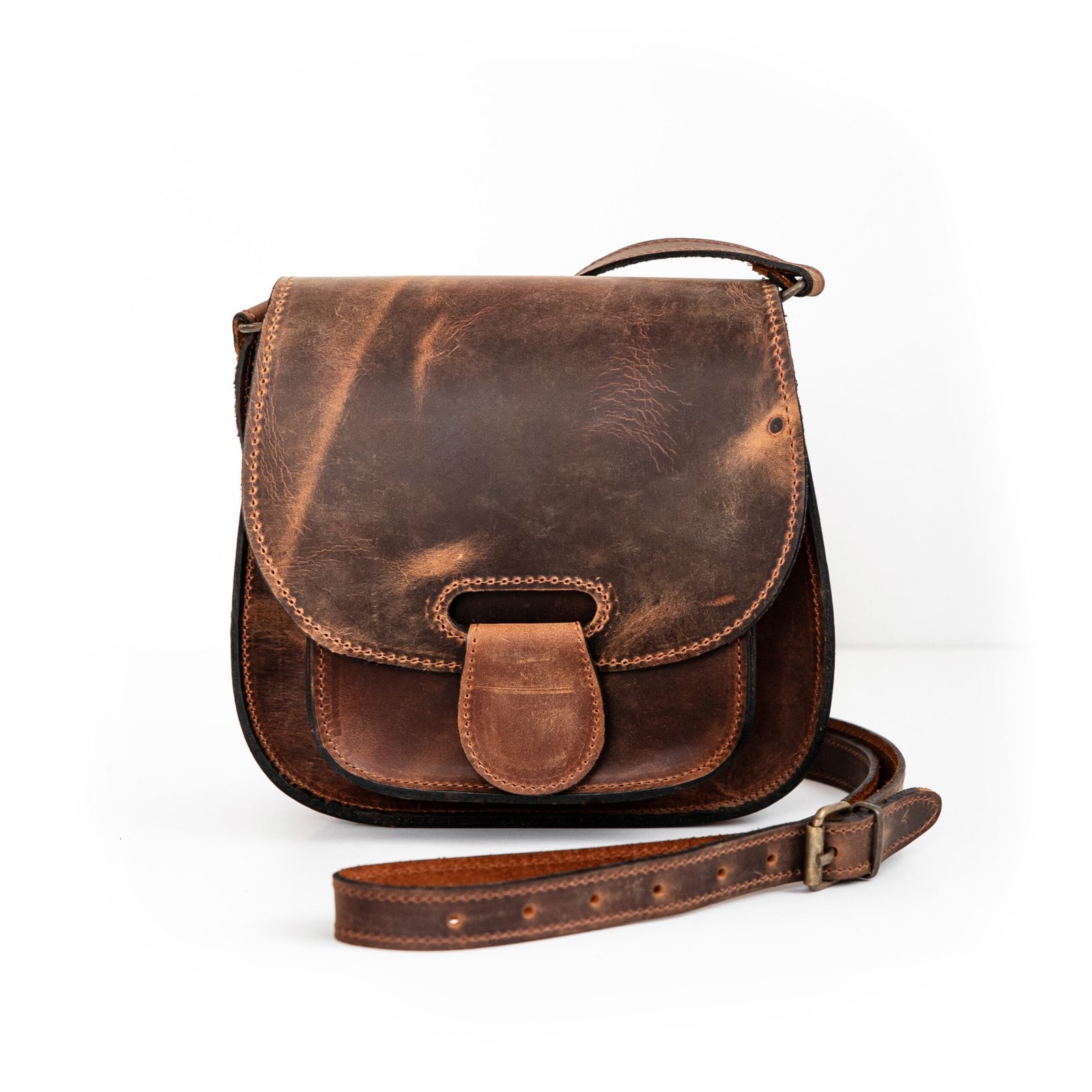 Built from sturdy full-grain leather, it features a rounded flap closure, strong stitching, and a detailed front pocket that reveal its honest, hand-built nature. Inside, the roomy compartment is sized for all your daily must-haves, from phone and wallet to small extras you pick up along the way.