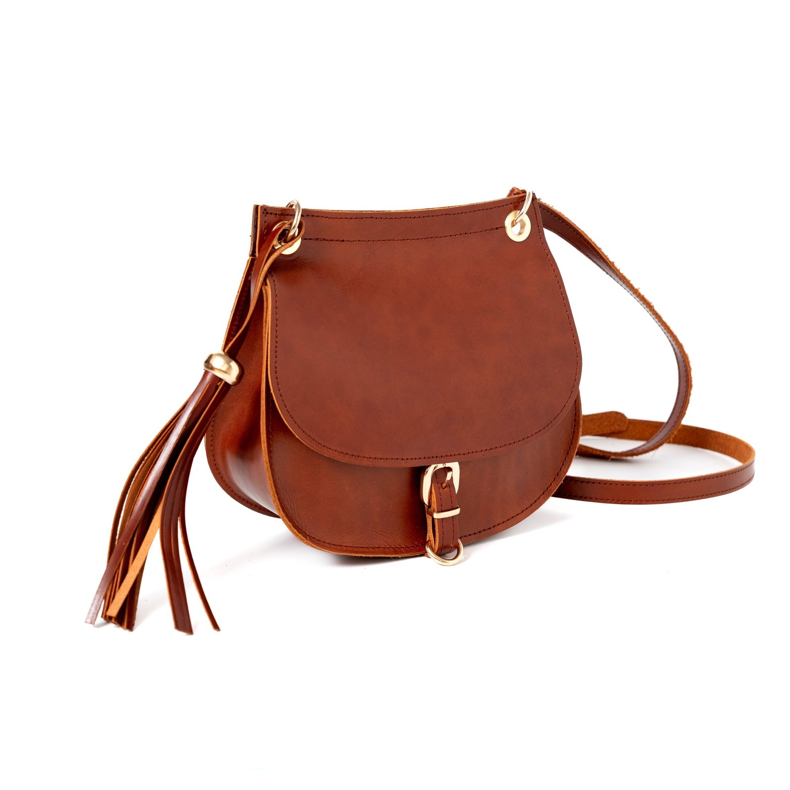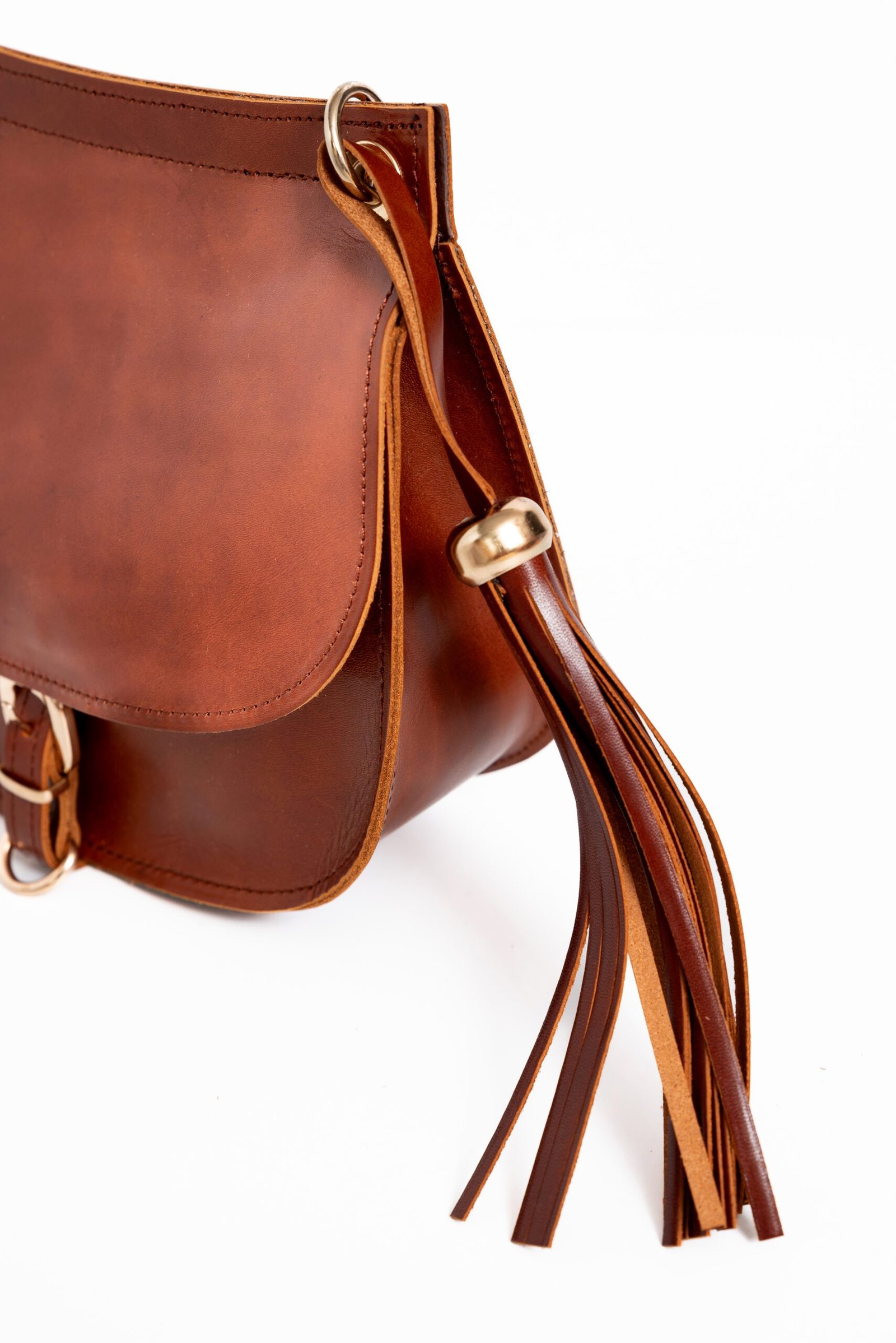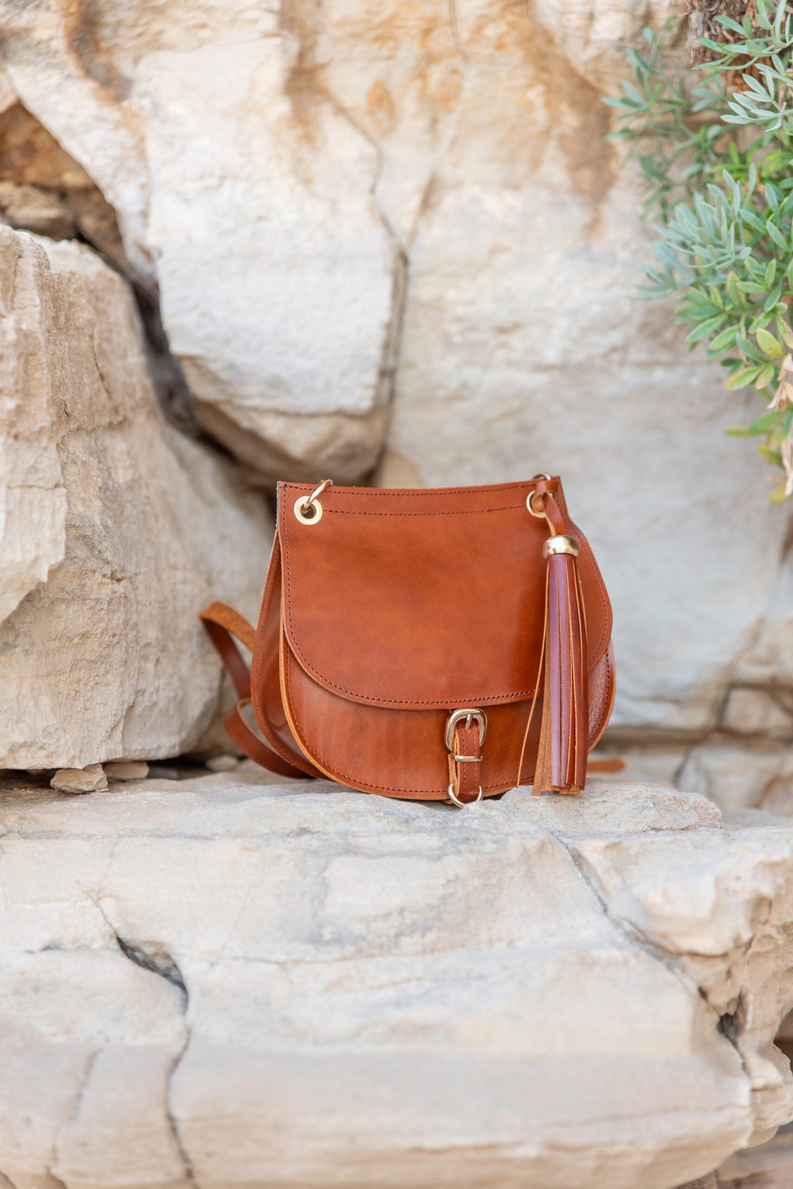 Inspired by timeless equestrian style and the goddess of the moon, the Leather Saddle Bag by Jirakis Handcrafted Leather captures elegance, strength, and subtle charm. With its rounded saddle silhouette, smooth buckle strap, and a playful leather tassel, this genuine leather bag combines classic design with modern versatility.