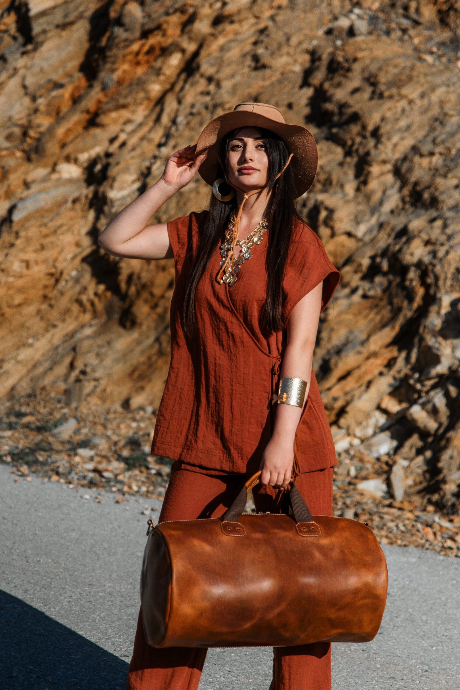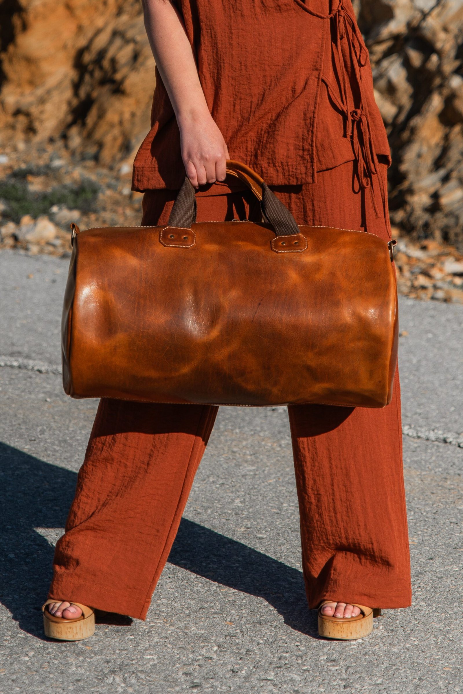 This handcrafted leather barrel bag combines timeless design with practical functionality, making it an ideal companion for travel, weekend escapes, or daily use. Made from high-quality full-grain leather, each piece carries its own unique texture and natural markings, giving the bag a distinctive character that evolves beautifully over time.