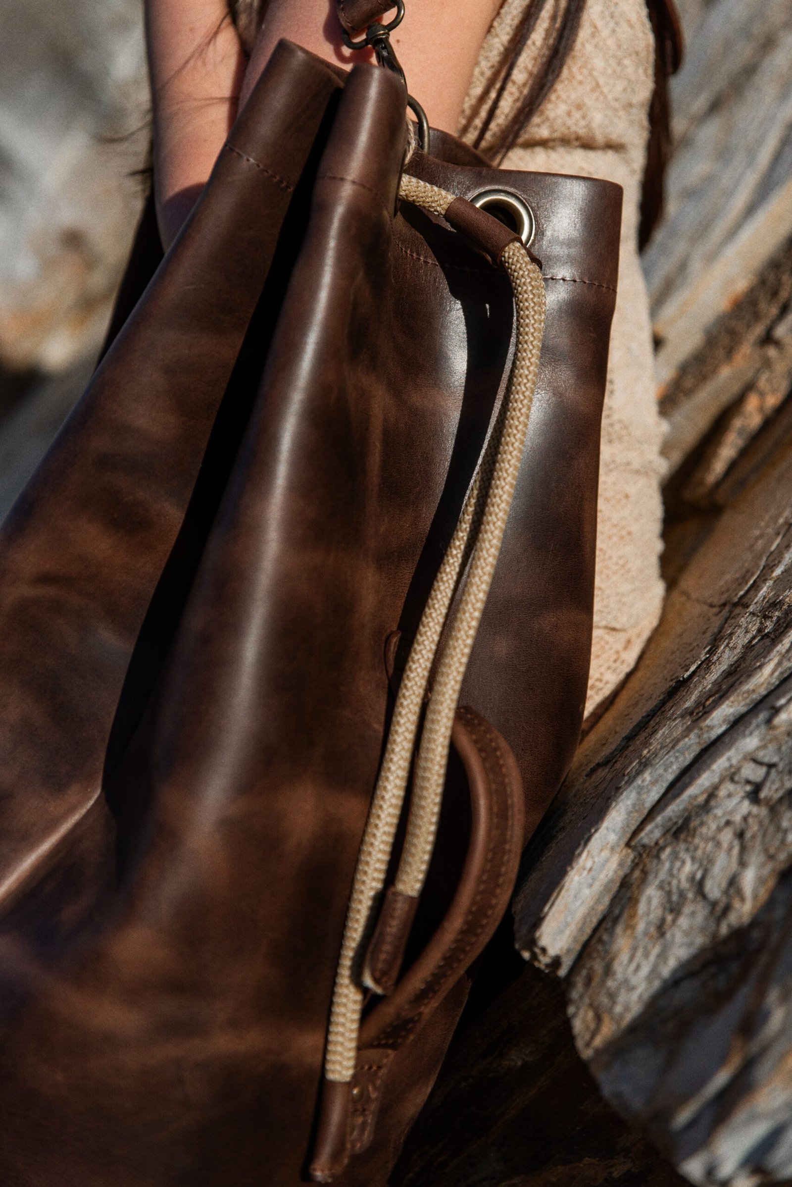 Handcrafted from premium full-grain leather, this sling travel bag grows richer and softer the more miles you share together. The bag’s cylindrical silhouette takes cues from traditional maritime duffels and old-world military gear, while the signature rope drawstring closure and solid brass grommets add an authentic touch rooted in seafaring history.