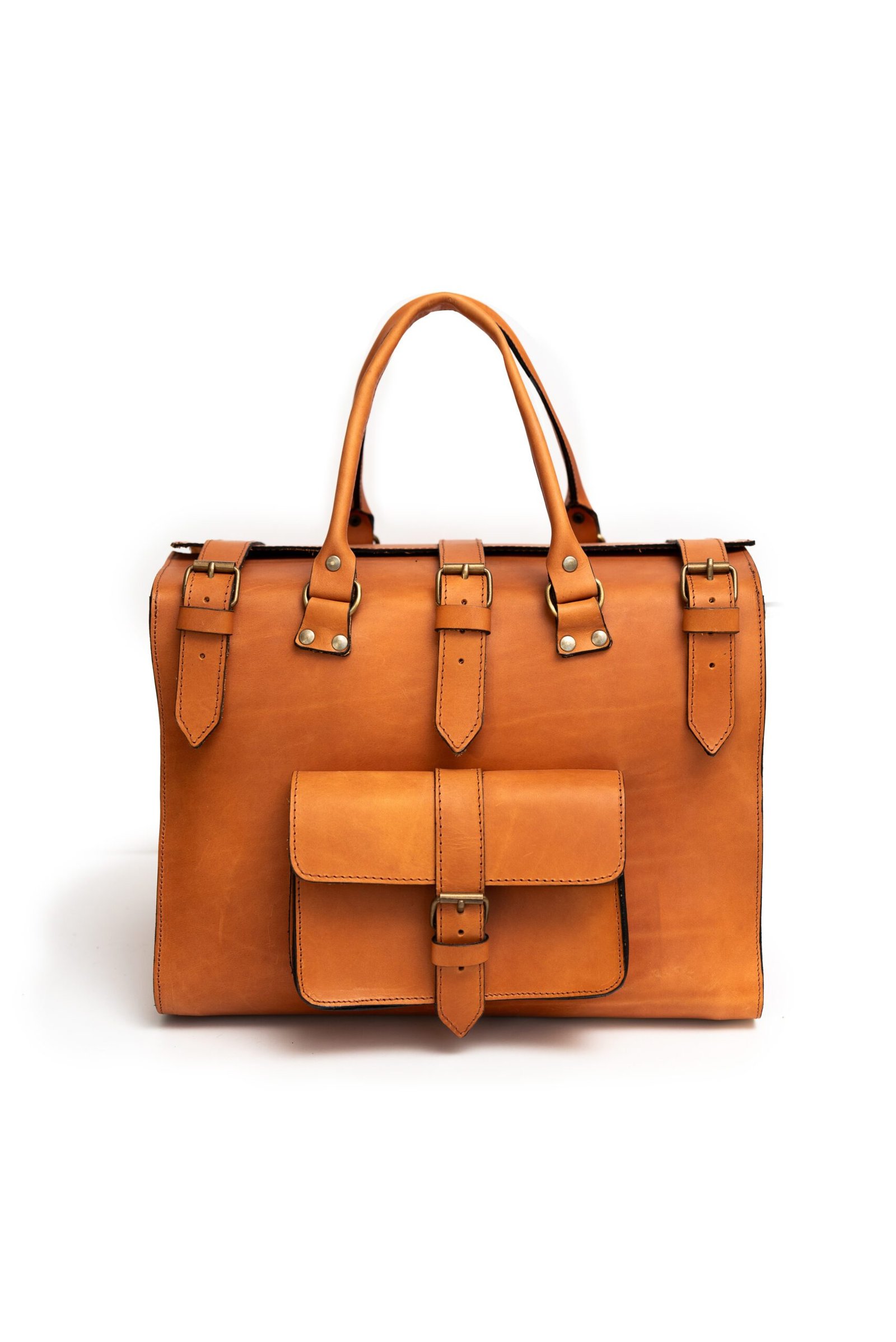 Tan leather business bag with classic flap and buckle straps, handcrafted by Jirakis Handcrafted Leather in Crete.